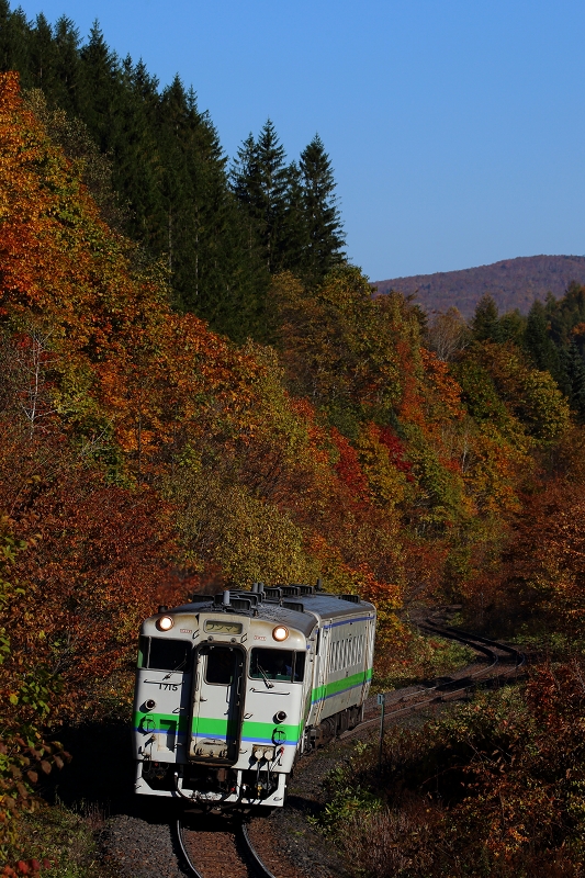 紅葉の盛りを迎えようとする常紋峠。キハ2連が力強く唸りながら走りすぎていった。 |
