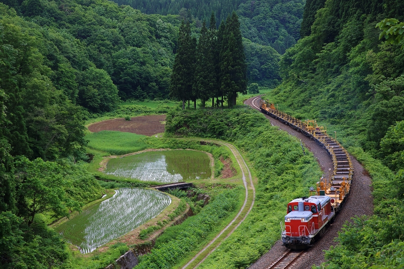 絶妙なバランスで配置された自然な形の田圃と脇を通るS字の線路。まるで絵にかいたような美しい風景が非常に気に入り、毎年の重要課題としていた。晴れより曇り、季節は新緑が残る田植え後の辺り。欲を言えば客車で撮りたい所だが、現実的には長さを考慮するとロンチキで狙うのが精一杯だった。